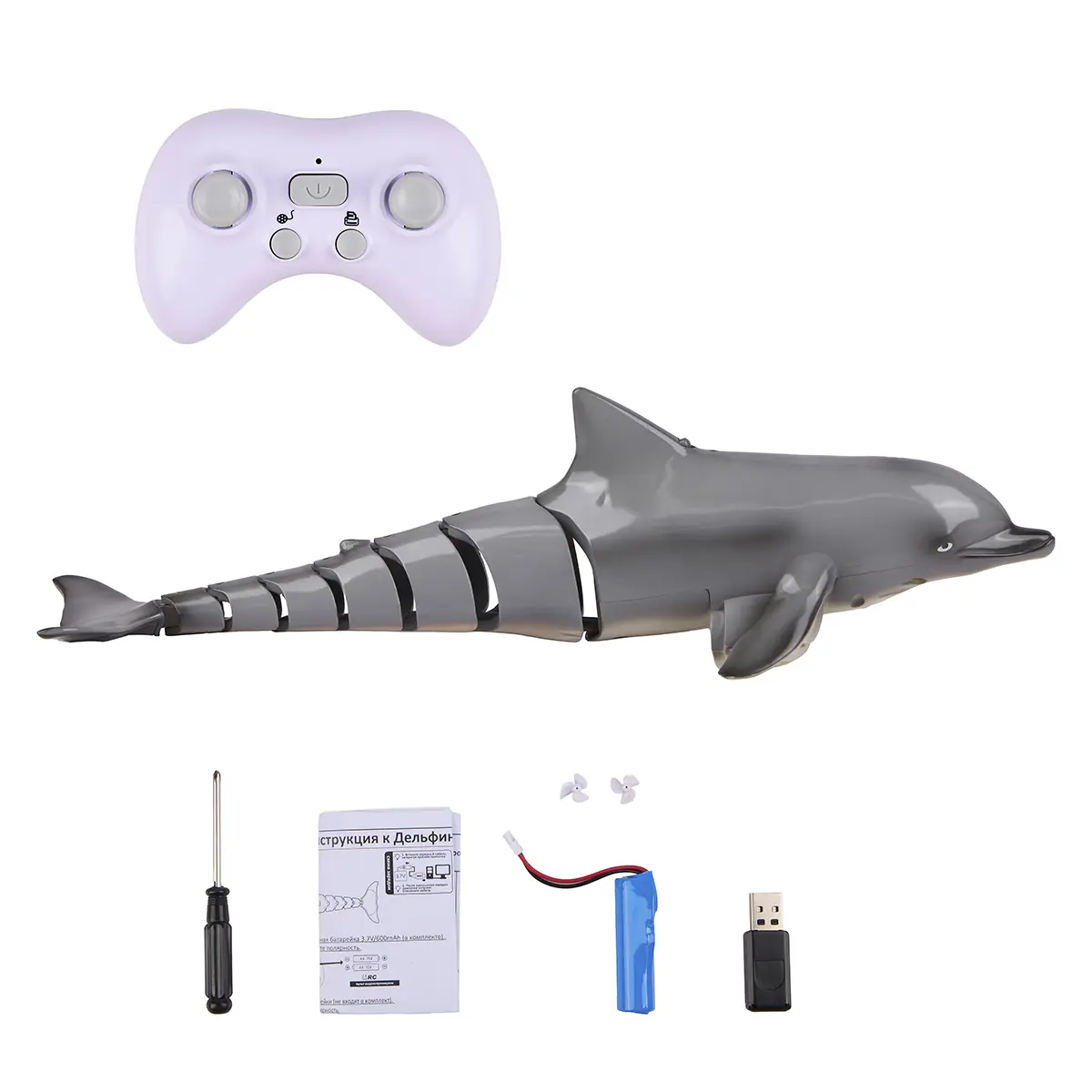 Комплектация Дельфин на радиоуправлении - 1 шт; Отвертка - 1 шт; Пульт дистанционного управления - 1 шт; запасные лопасти - 2 шт; Аккумулятор - 1 шт; зарядное устройство – 1 шт; инструкция – 1 шт.