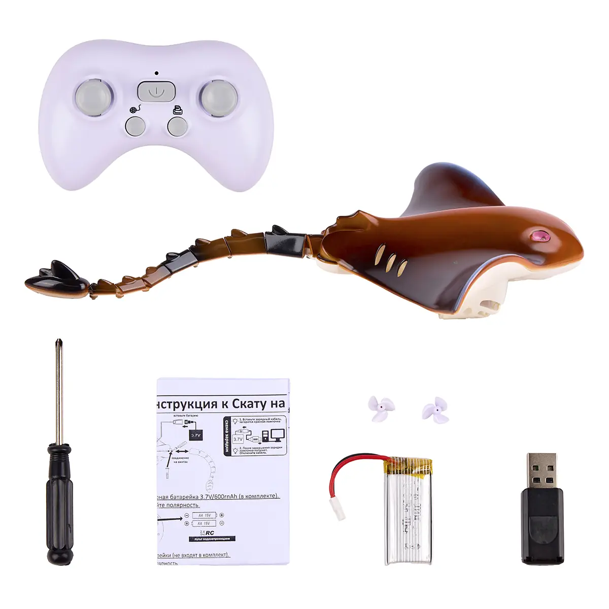 Комплектация Скат на радиоуправлении - 1 шт; Отвертка - 1 шт; Пульт дистанционного управления - 1 шт; запасные лопасти - 2 шт; Аккумулятор - 1 шт; инструкция – 1 шт.